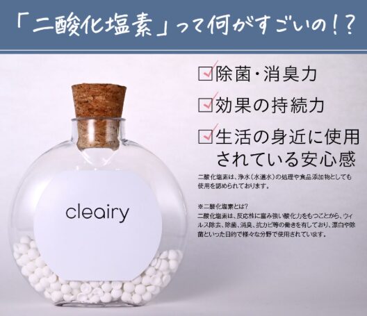 クレアリーは香りでごまかすタイプではなく、二酸化塩素でニオイの元を分解する消臭剤です。そのため、交換時期を過ぎると「効かない」と感じやすくなります。